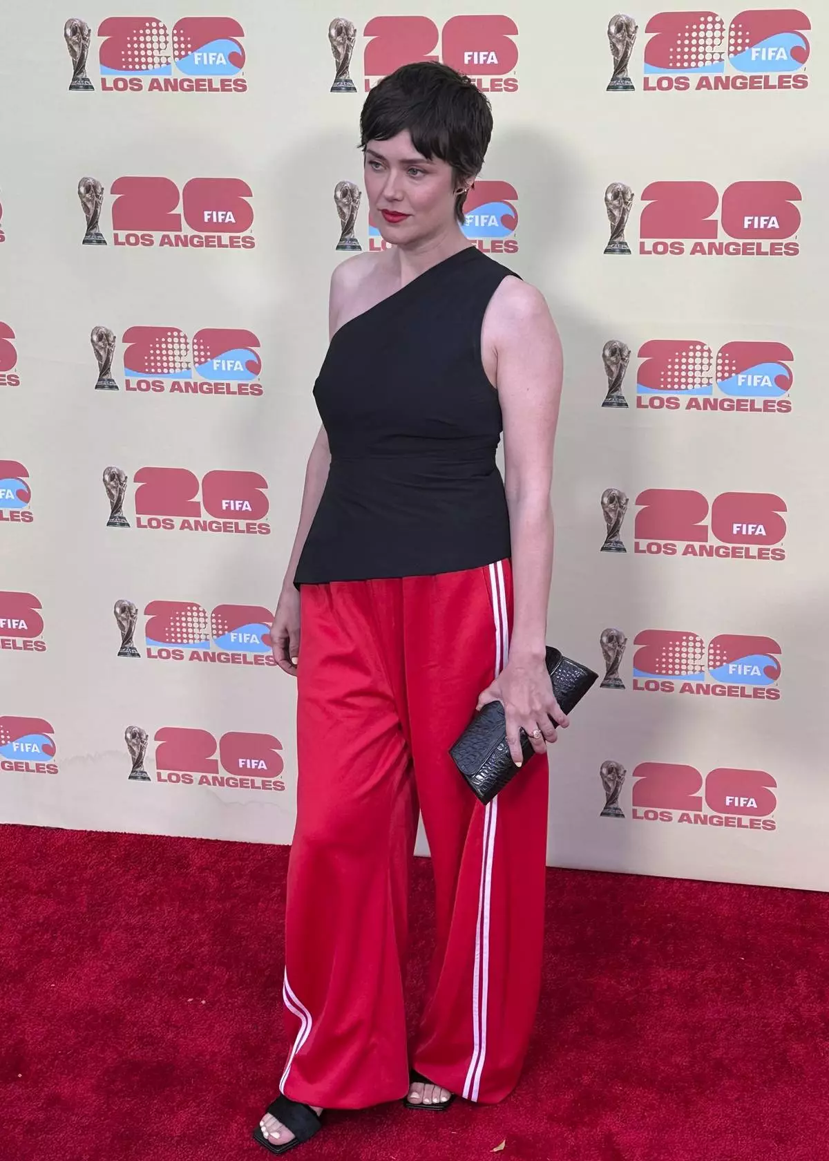 Actor Megan Boone attends a party at the Fox Studio Lot in Los Angeles on Wednesday, June 11, 2025, to mark one year to go before the start of the 2026 World Cup in North America. (AP Photo/Greg Beacham)