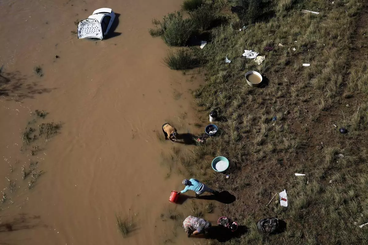 Women wash their clothes along the river next a car that was swept through by floods in Mthatha, South Africa, Thursday, June 12, 2025. (AP Photo/Themba Hadebe)