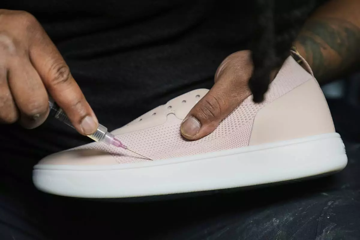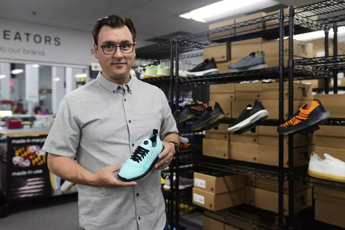 Alan Guyan, founder and CEO of Made Plus, holds a new colorway of the company's "bangr," a pickleball sneaker, at the company's manufacturing facility in Annapolis, Md., Tuesday, June 10, 2025. (AP Photo/Stephanie Scarbrough)