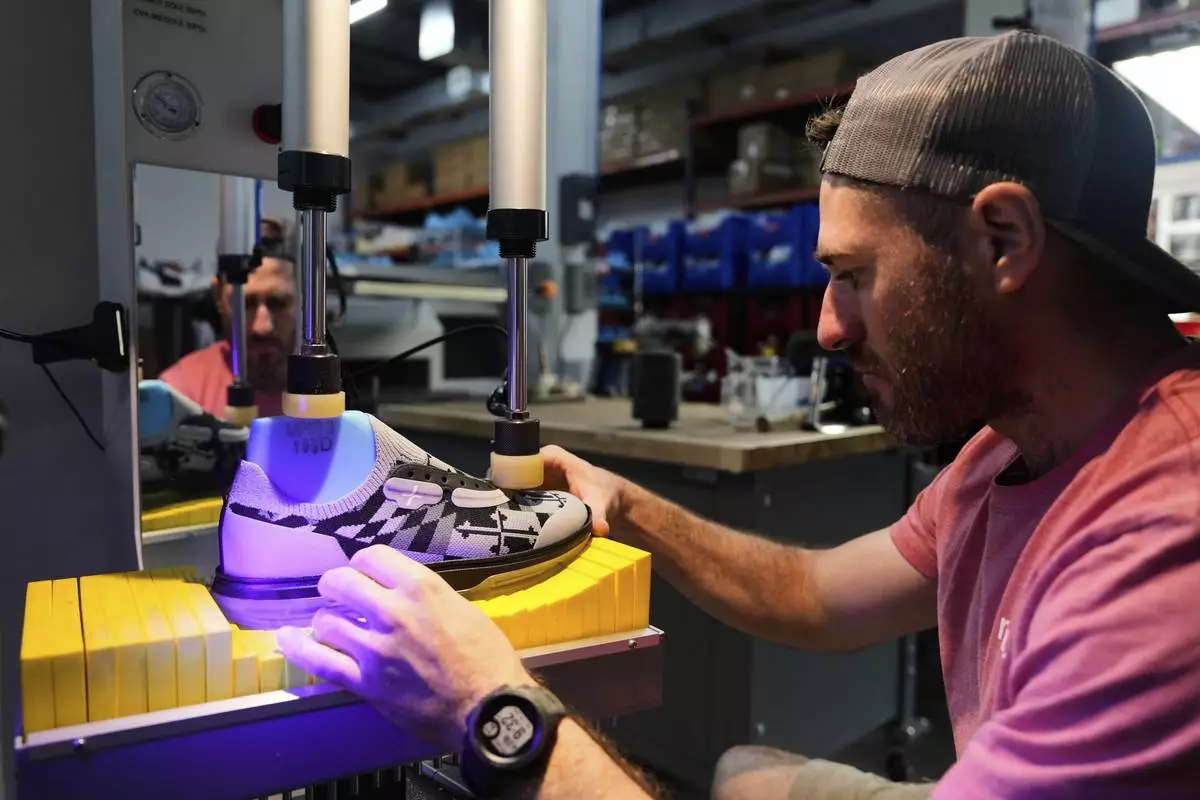 Andrew McLean, assembly technician at Made Plus, performs visual checks on a shoe before bonding the outsole to the upper at the company's manufacturing facility in Annapolis, Md., Tuesday, June 10, 2025. (AP Photo/Stephanie Scarbrough)