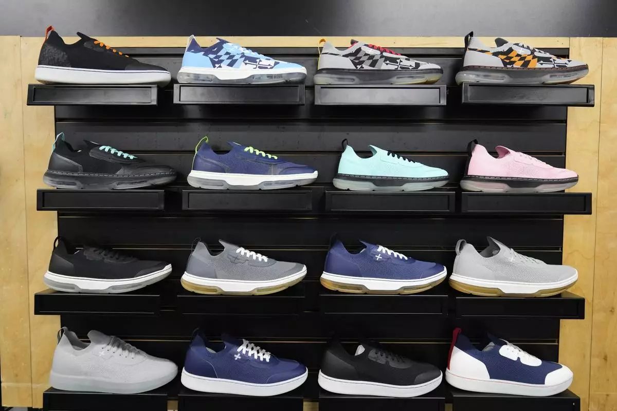 A collection of Made Plus sneakers is on display at the company's manufacturing facility in Annapolis, Md., Tuesday, June 10, 2025. (AP Photo/Stephanie Scarbrough)