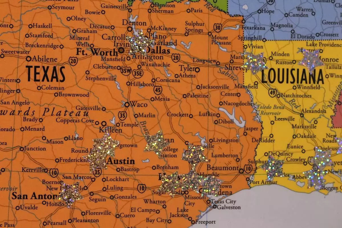 Star stickers are placed on a map showing where in Texas and Louisiana the Massachusetts Medication Abortion Access Project sends medication to their clients, May 13, 2025, in Somerville, Mass. (AP Photo/Charles Krupa)