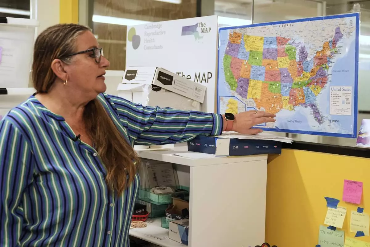 Dr. Angel Foster, co-founder of Massachusetts Medication Abortion Access Project, points out on a map of the United States where her organization provides care, May 13, 2025, in Somerville, Mass. (AP Photo/Charles Krupa)