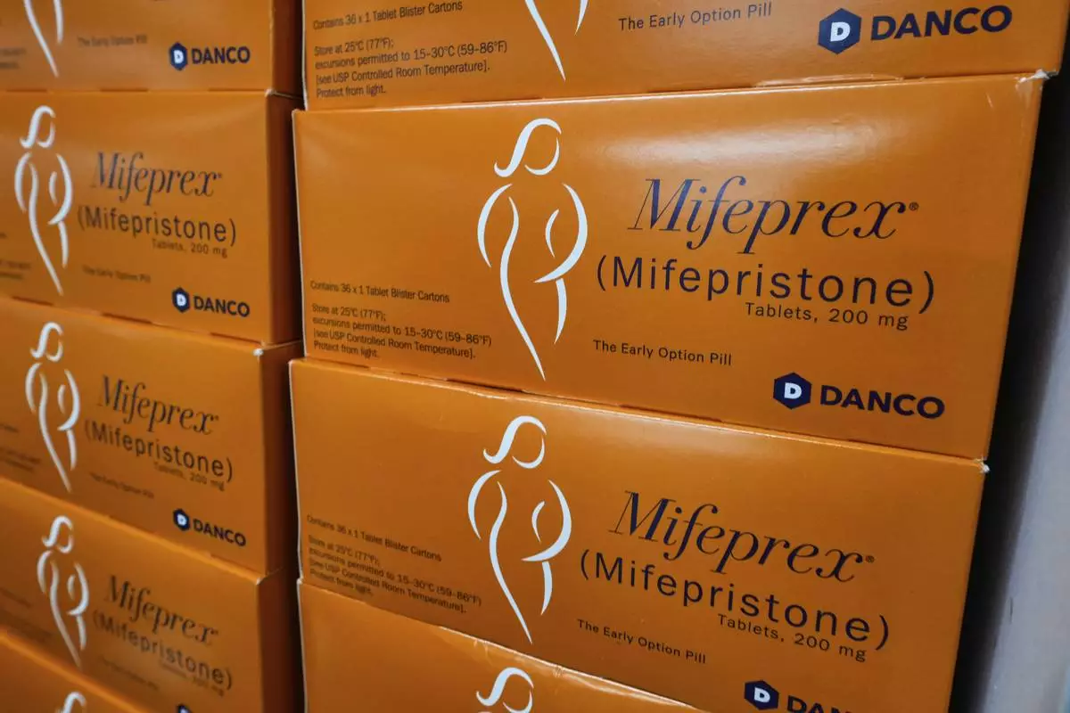Boxes of Mifeprex, which will be sent out to clients, are stacked at the Massachusetts Medication Abortion Access Project, May 13, 2025, in Somerville, Mass. (AP Photo/Charles Krupa)