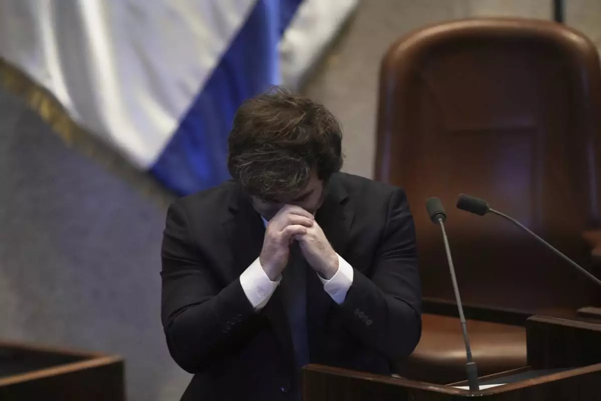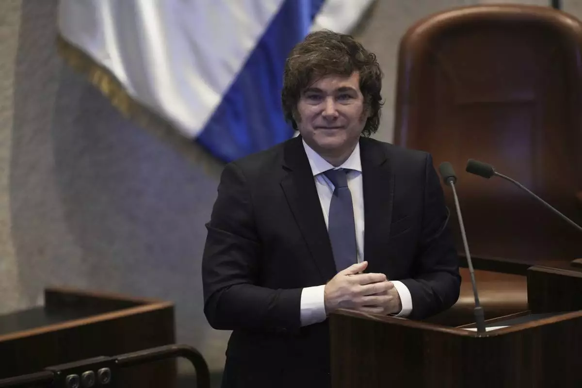 Argentina's President Javier Milei gestures to lawmakers as he takes the podium at the Knesset, Israel's parliament, in Jerusalem, Wednesday, June 11, 2025. (AP Photo/Ohad Zwigenberg)