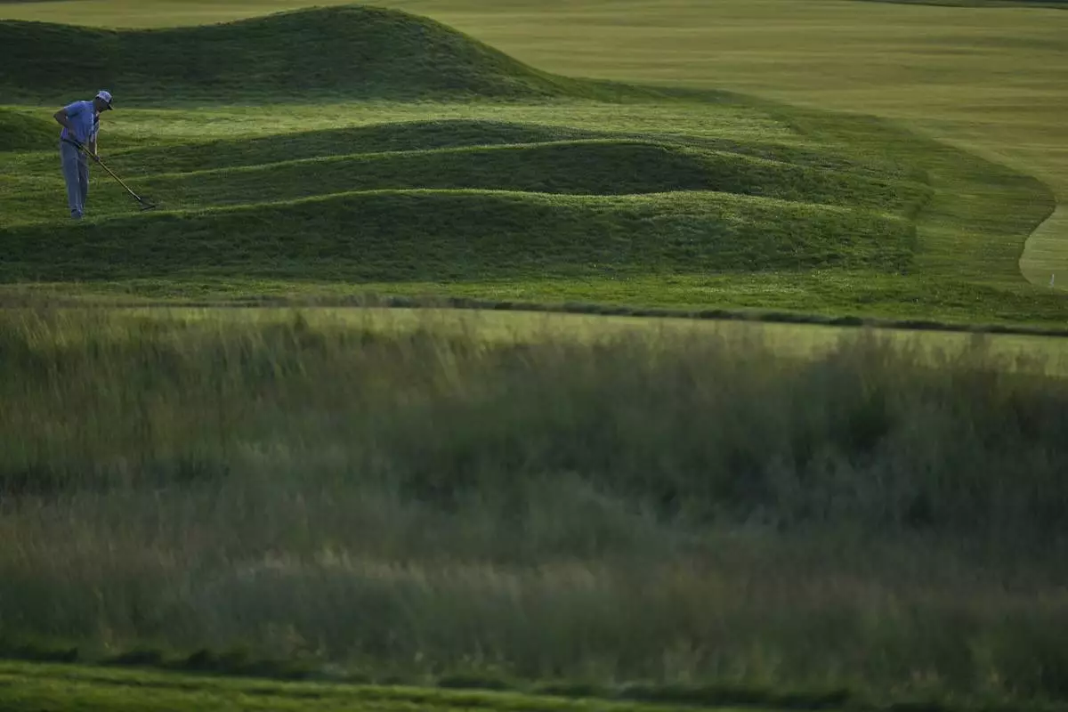 A person uses a rake to maintain the course before the start of the first round of U.S. Open golf tournament at Oakmont Country Club Thursday, June 12, 2025, in Oakmont, Pa. (AP Photo/Seth Wenig)