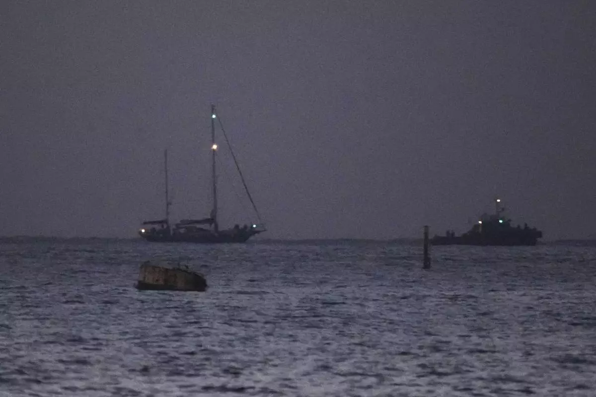 The Gaza-bound aid boat, Madleen, left, under escort of Israeli naval forces making its way toward Ashdod Port in southern Israel after being seized by Israeli forces, Monday, June 9, 2025. (AP Photo/Leo Correa)
