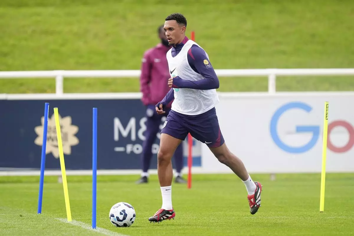 England's Trent Alexander-Arnold attends a training session at St George's Park, in Burton upon Trent, England, Monday, June 9, 2025. (Mike Egerton/PA via AP)