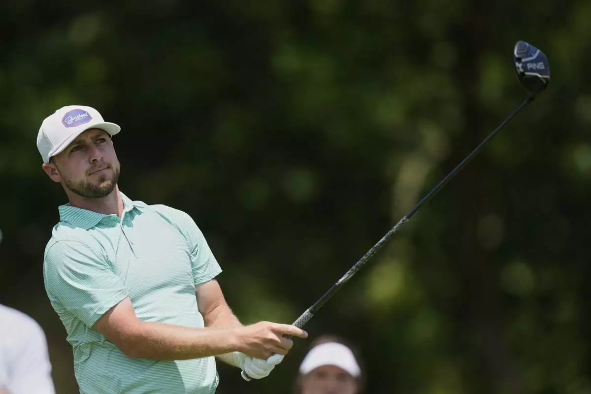 Alistair Docherty tees off on the second hole during a practice round ahead of the U.S. Open golf tournament at Oakmont Country Club Wednesday, June 11, 2025, in Oakmont, Pa. (AP Photo/Charlie Riedel)