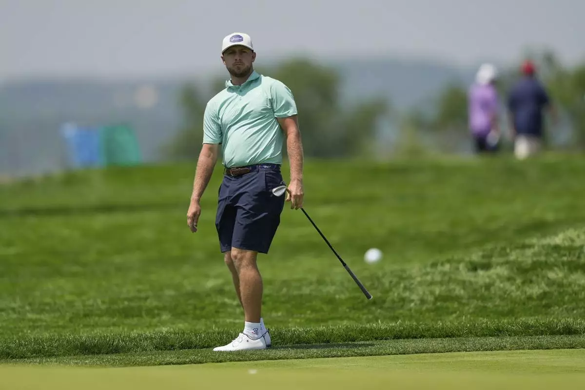 Alistair Docherty chips on the third hole during a practice round ahead of the U.S. Open golf tournament at Oakmont Country Club Wednesday, June 11, 2025, in Oakmont, Pa. (AP Photo/Charlie Riedel)