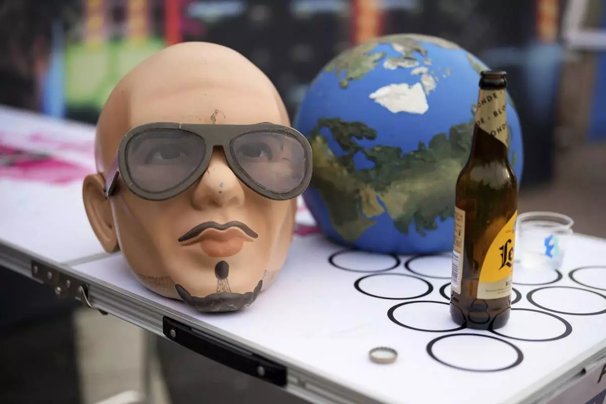A Pitbull mask on a beer pong table on Monday, June 9, 2025, in London. (Photo by Scott A Garfitt/Invision/AP)