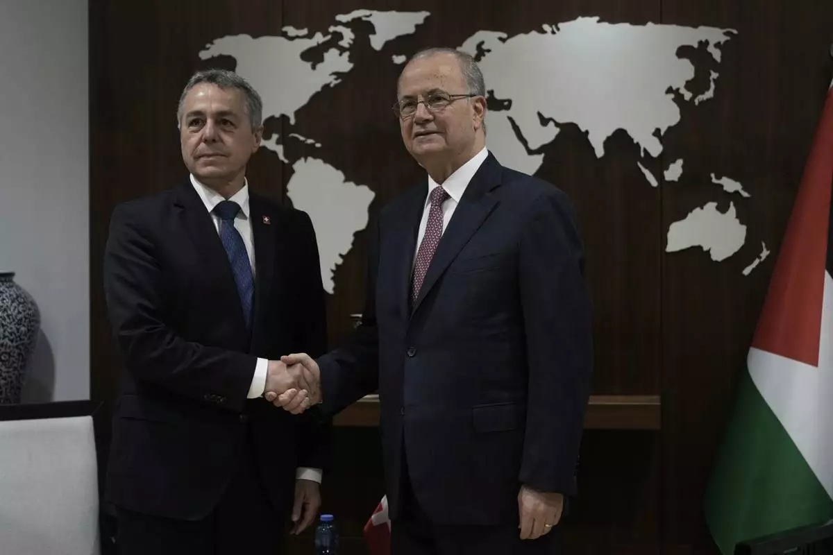 Swiss Federal Councillor Ignazio Cassis, left, shakes hands with Palestinian Prime Minister Mohammad Mustafa, right, in the West Bank city of Ramallah, Wednesday, June 11, 2025. (AP Photo/Majdi Mohammed)
