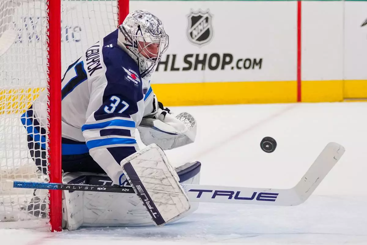 FILE - Winnipeg Jets goaltender Connor Hellebuyck blocks a shot by the Dallas Stars during the first period of an NHL hockey game April 10, 2025, in Dallas. (AP Photo/Julio Cortez, File)