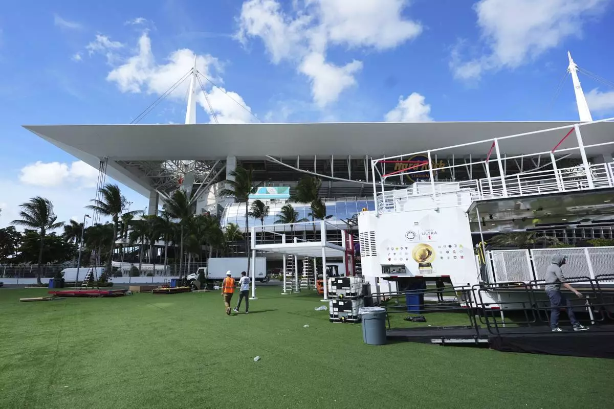 People work outside of Hard Rock Stadium during preparations for Saturday's opening match in the Club World Cup soccer tournament, Wednesday, June 11, 2025, in Miami Gardens, Fla. (AP Photo/Lynne Sladky)