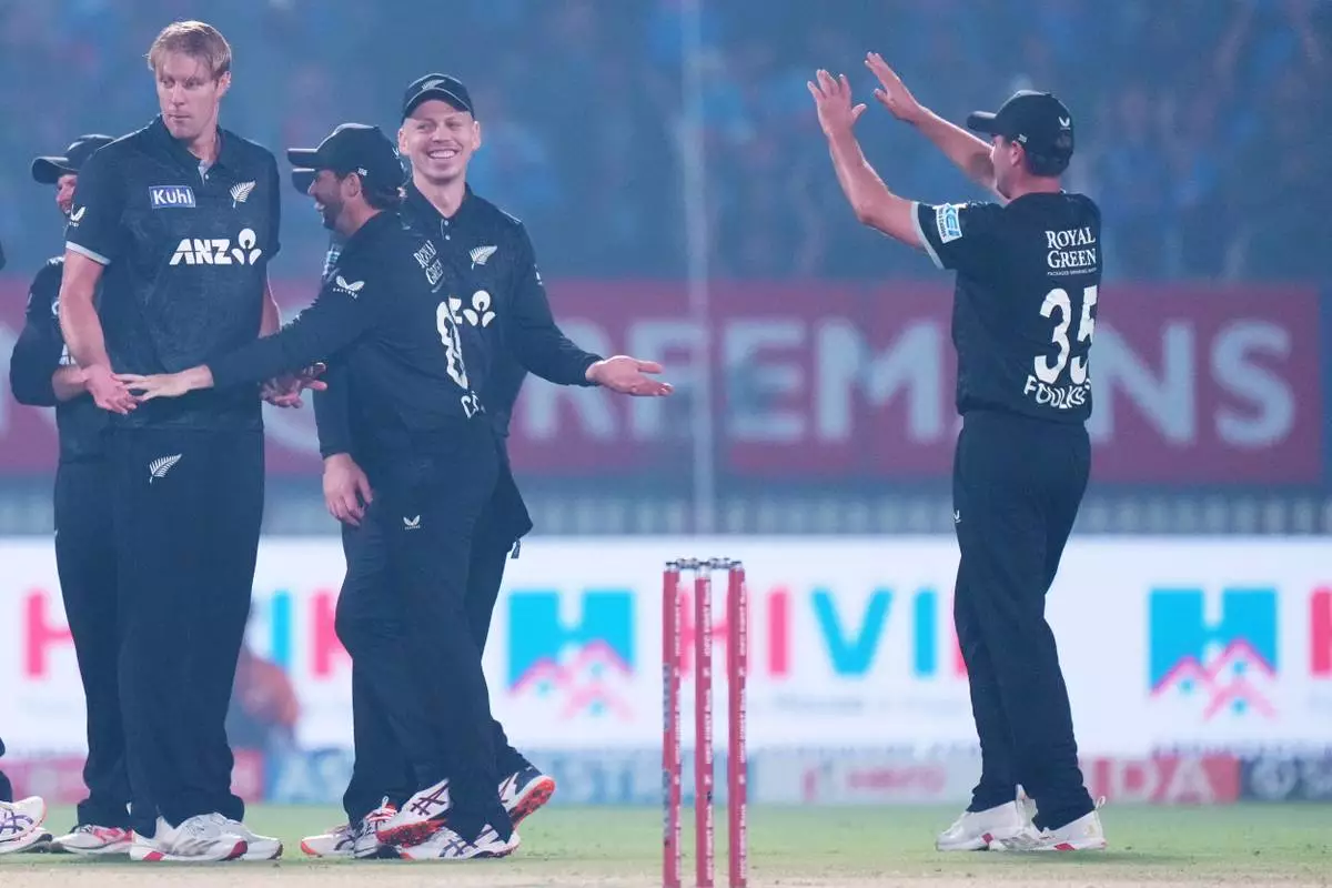 New Zealand's Kyle Jamieson, left, celebrates with teammates the wicket of India's Virat Kohli during the first One Day International cricket match between India and New Zealand in Vadodara, India, Sunday, Jan. 11, 2026. (AP Photo/Ajit Solanki)
