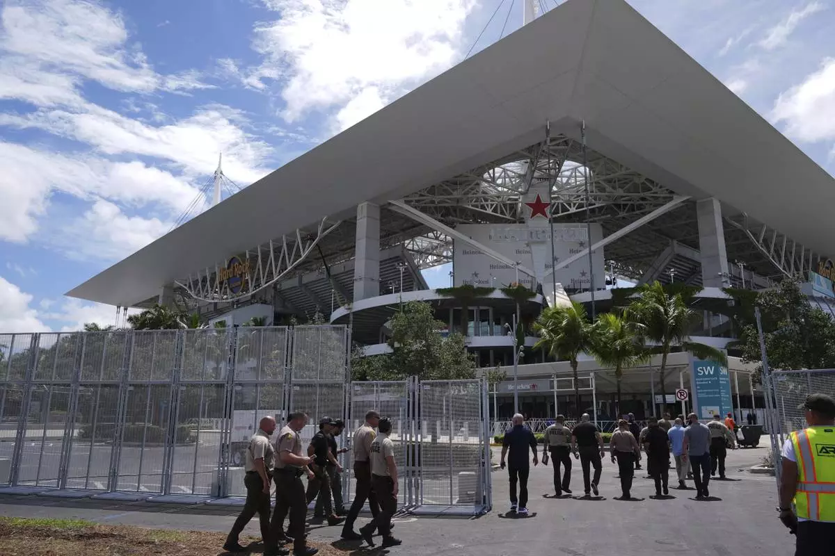 Law enforcement personnel walk outside Hard Rock Stadium during preparations for Saturday's opening match in the Club World Cup soccer tournament, Wednesday, June 11, 2025, in Miami Gardens, Fla. (AP Photo/Rebecca Blackwell)