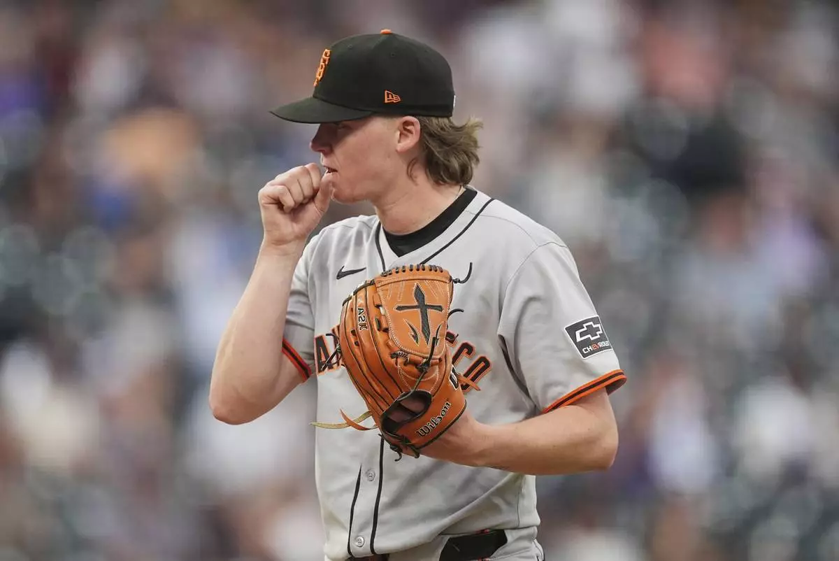 San Francisco Giants starting pitcher Hayden Birdsong reacts after giving up a solo home run to Colorado Rockies' Mickey Moniak in the sixth inning of a baseball game, Thursday, June 12, 2025, in Denver. (AP Photo/David Zalubowski)