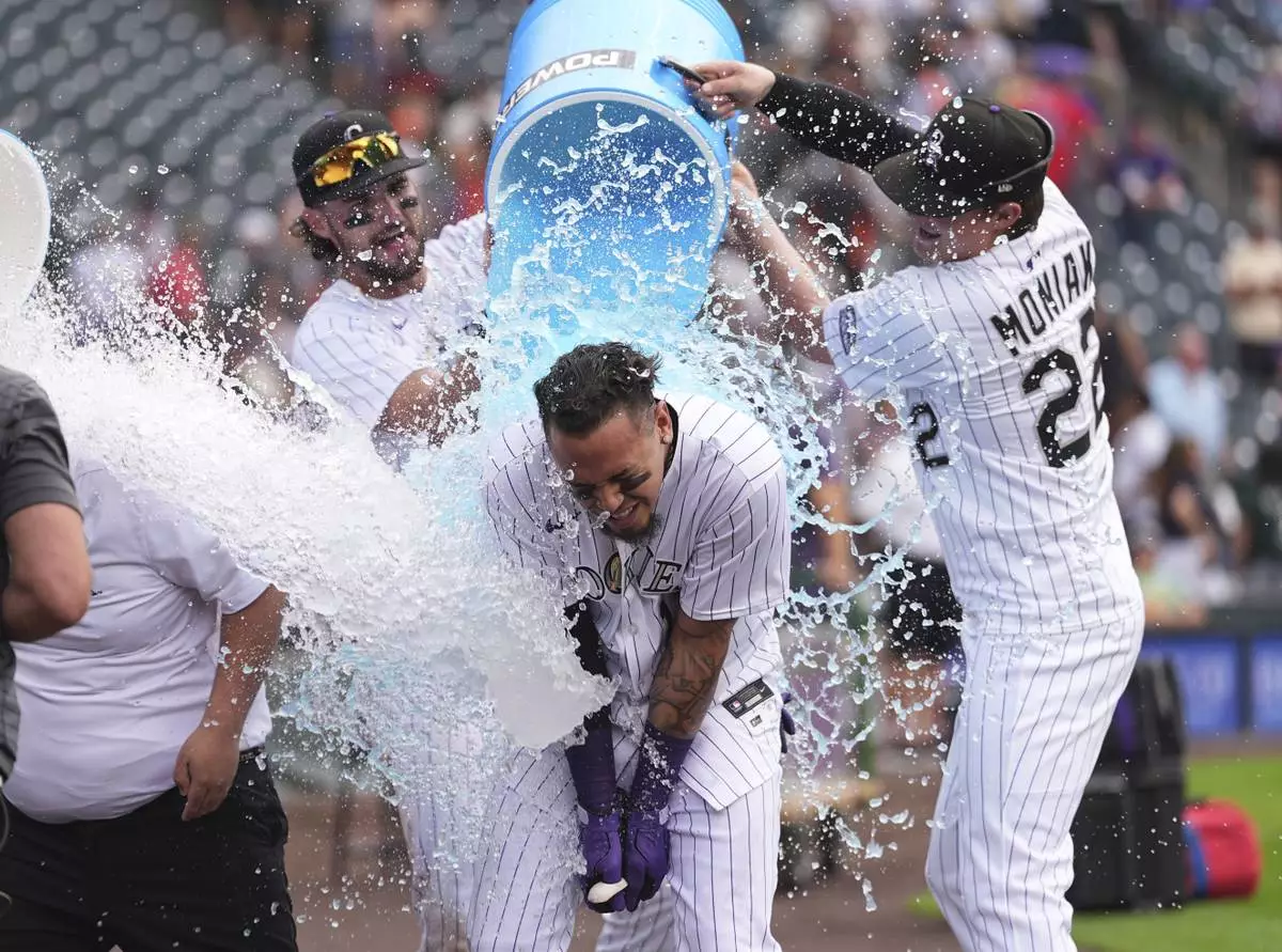 Colorado Rockies' Orlando Arcia, center, is doused after hitting a walkoff single to drive in two runs by Sam Hilliard, back left, and Mickey Moniak after the Rockies' victory over the San Francisco Giants in a baseball game Thursday, June 12, 2025, in Denver. (AP Photo/David Zalubowski)