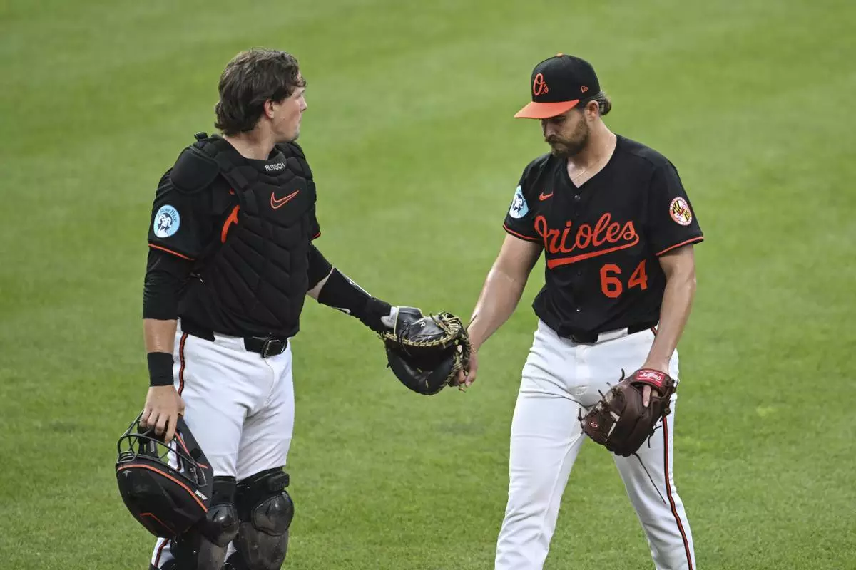 Baltimore Orioles pitcher Dean Kremer (64) is greeted by catcher Adley Rutschman, left, as they walk off the field during the third inning of a baseball game against the Detroit Tigers in Baltimore, Thursday, June 12, 2025. (AP Photo/Terrance Williams)