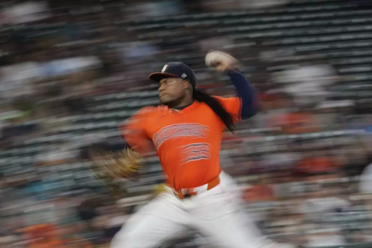 In this image taken with a slow shutter speed, Houston Astros starting pitcher Framber Valdez throws against the Chicago White Sox during the first inning of a baseball game Thursday, June 12, 2025, in Houston. (AP Photo/David J. Phillip)
