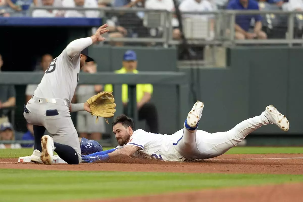 Kansas City Royals' Nick Loftin, right, slides into third with a triple past New York Yankees third baseman Oswald Peraza, left, in the fifth inning of a baseball game Thursday, June 12, 2025, in Kansas City, Mo. (AP Photo/Ed Zurga)