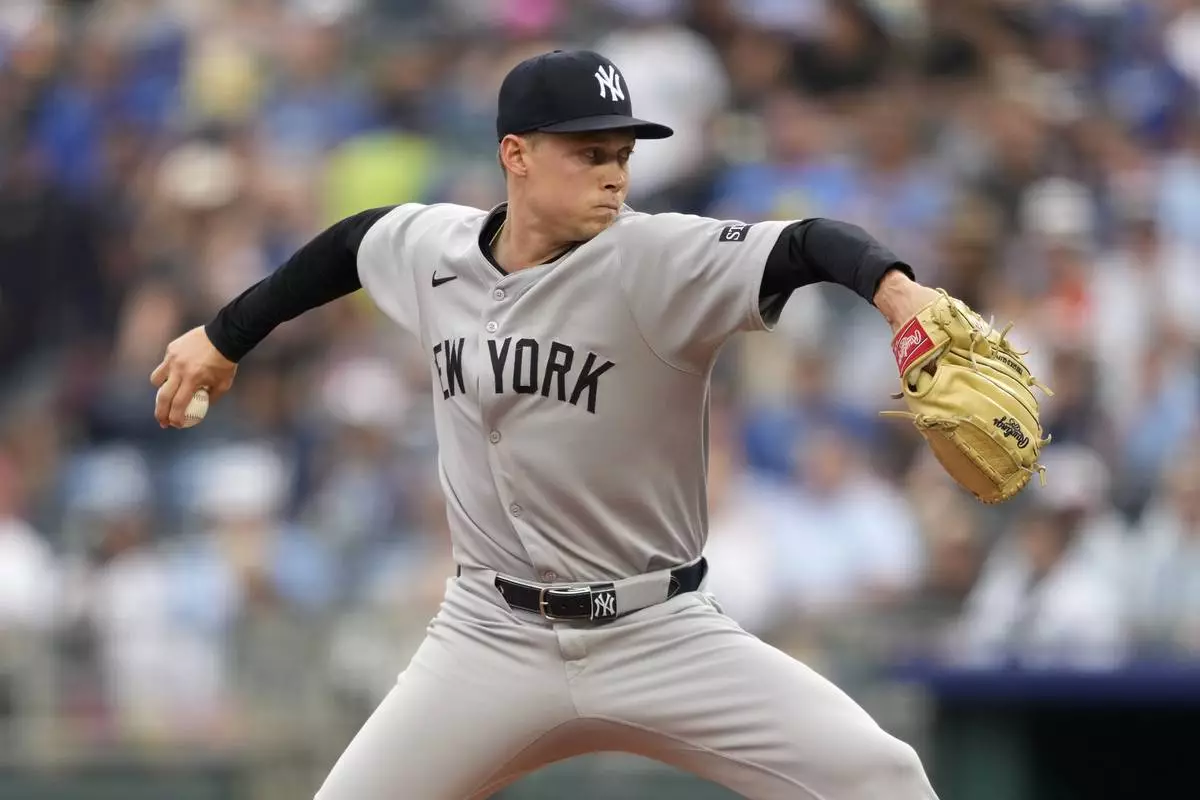 New York Yankees starting pitcher Will Warren throws in the first inning of a baseball game against the Kansas City Royals, Thursday, June 12, 2025, in Kansas City, Mo. (AP Photo/Ed Zurga)