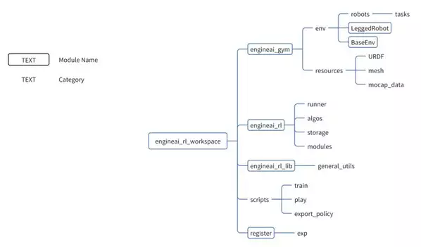 The training framework, EngineAI RL Workspace, is a modular reinforcement learning platform built specifically for legged robotics. It integrates the full development pipeline, from environment setup to algorithm training and performance evaluation. The system is architected with four core clusters: environment modules, algorithm engines, shared toolkits, and integration layers. Each component is independently encapsulated, allowing developers to modify modules without impacting the entire system. This design significantly reduces communication overhead and facilitates multi-person collaboration.