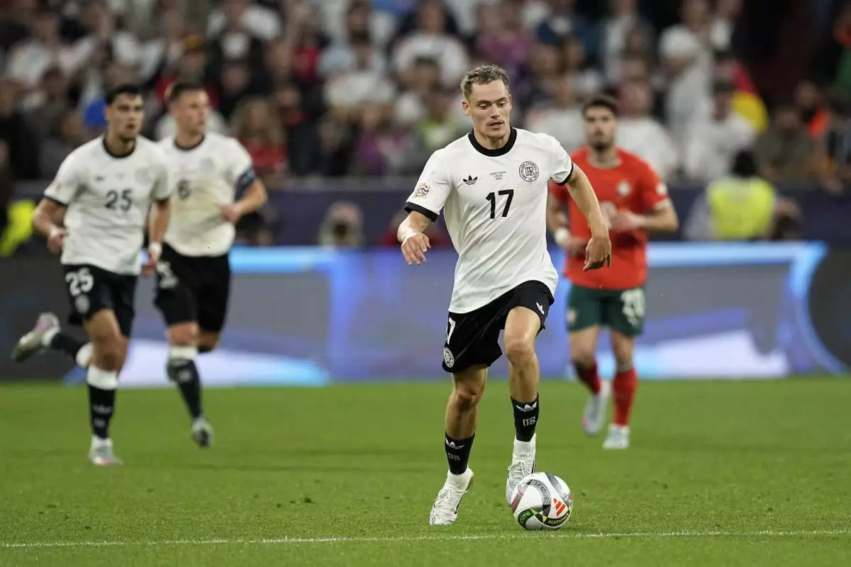 Germany's Florian Wirtz runs with the ball during the Nations League semifinal soccer match between Portugal and Germany at the Munich Football Arena, in Munich, Germany, Wednesday, June 4, 2025. (AP Photo/Martin Meissner)