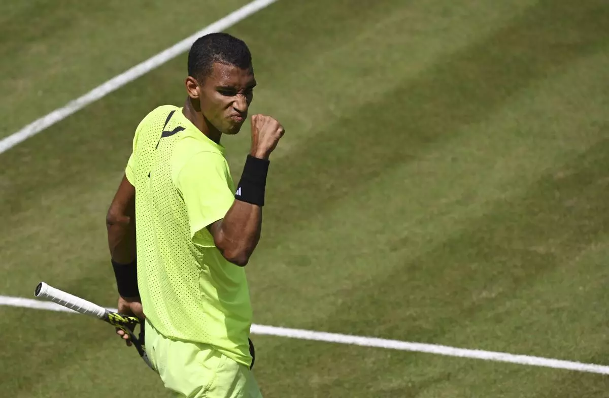 Canada's Felix Auger-Aliassime reacts after winning a point against Germany's Justin Engel during their quarterfinal tennis match of the Stuttgart Open in Stuttgart, Germany, Friday June 13, 2025. (Marijan Murat/dpa via AP)