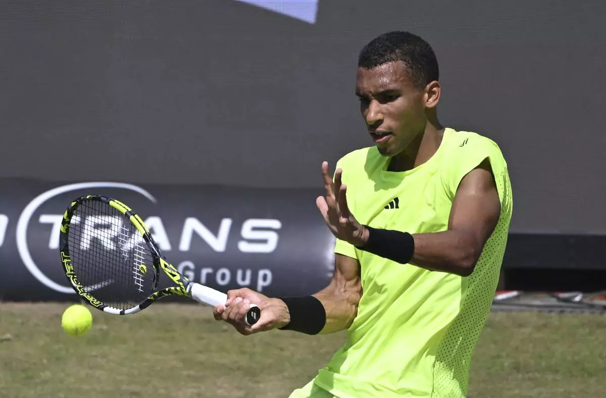 Canada's Felix Auger-Aliassime returns the ball to Germany's Justin Engel during their quarterfinal tennis match of the Stuttgart Open in Stuttgart, Germany, Friday June 13, 2025. (Marijan Murat/dpa via AP)