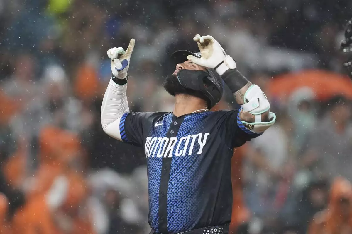 Detroit Tigers' Gleyber Torres celebrates his home run against the Cincinnati Reds in the seventh inning during a baseball game, Friday, June 13, 2025, in Detroit. (AP Photo/Paul Sancya)