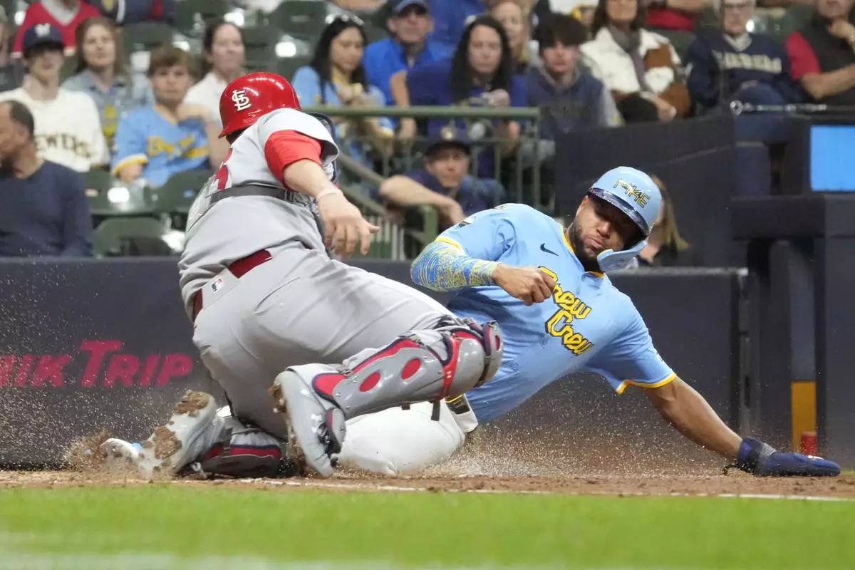 Milwaukee Brewers' Jackson Chourio, right, scores against St. Louis Cardinals catcher Pedro Pagés, left, on a single by Brewers' Christian Yelich during the sixth inning of a baseball game Friday, June 13, 2025, in Milwaukee. (AP Photo/Kayla Wolf)