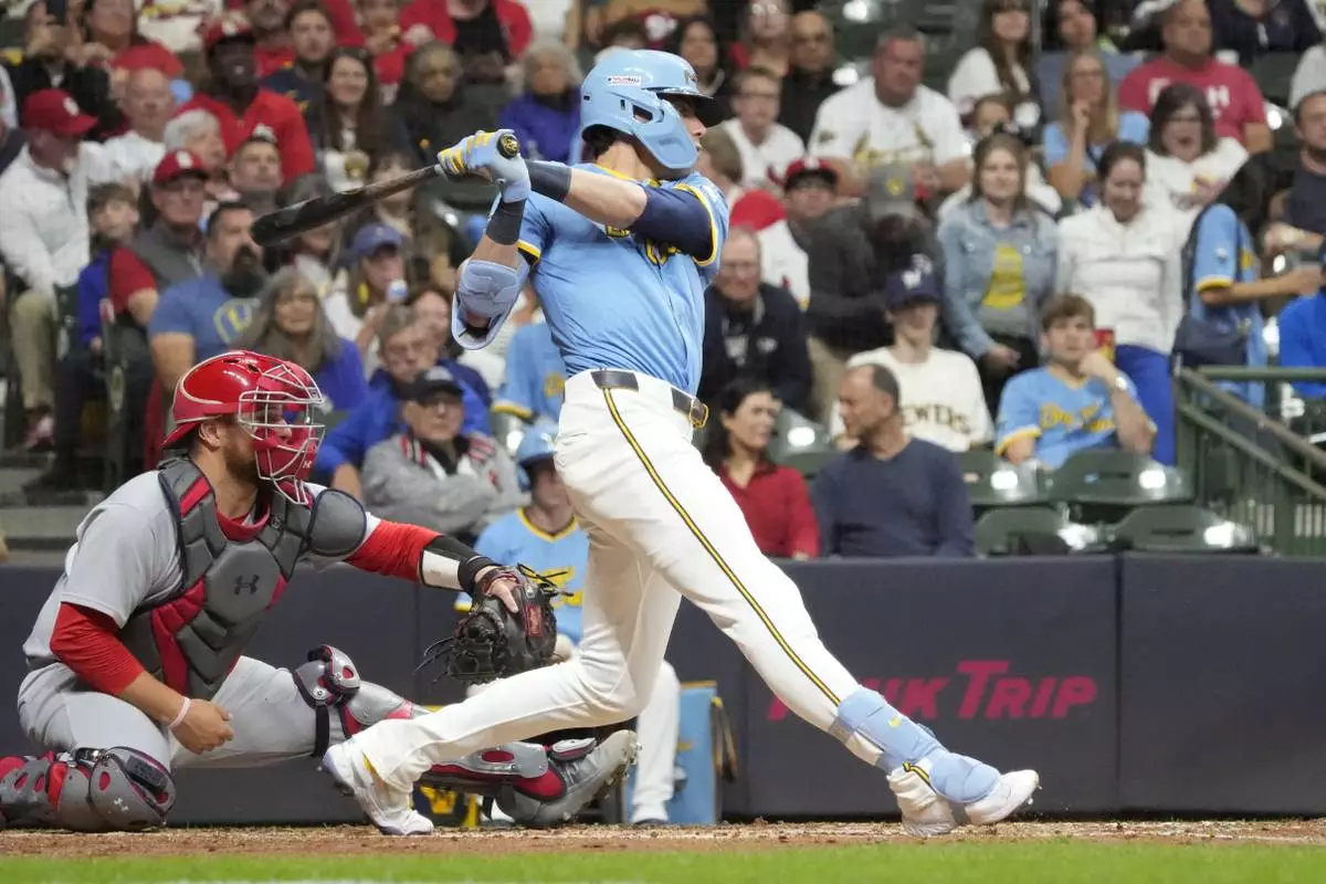 Milwaukee Brewers' Christian Yelich hits an RBI single during the sixth inning of a baseball game against the St. Louis Cardinals, Friday, June 13, 2025, in Milwaukee. (AP Photo/Kayla Wolf)