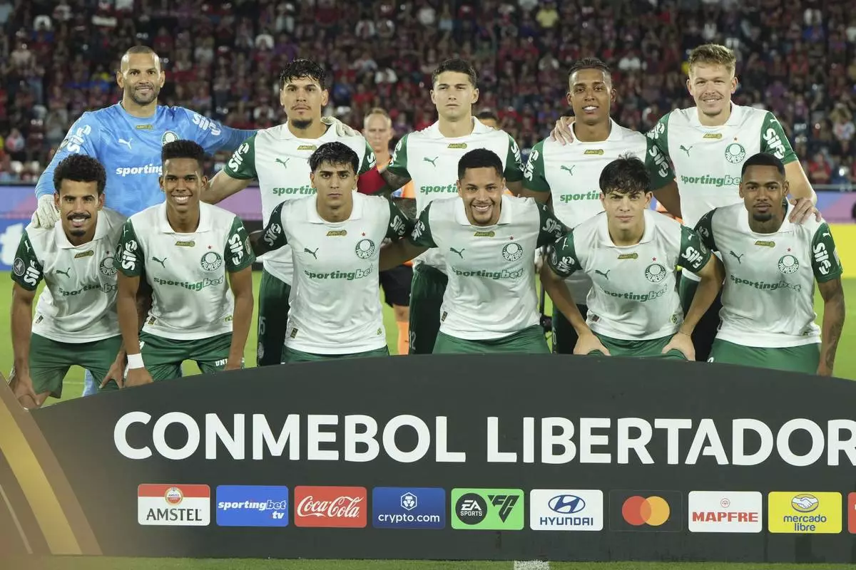 FILE - Players of Brazil's Palmeiras pose for a team photo before a Copa Libertadores Group G soccer match against Paraguay's Cerro Porteno at La Nueva Olla stadium in Asuncion, Paraguay, Wednesday, May 7, 2025. (AP Photo/Fernando Calistro, file)