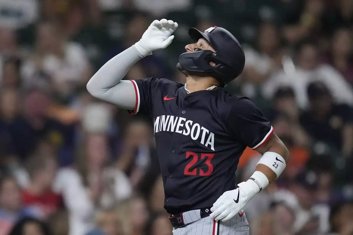Minnesota Twins' Royce Lewis celebrates after hitting a solo home run during the sixth inning of a baseball game against the Houston Astros, Friday, June 13, 2025, in Houston. (AP Photo/Kevin M. Cox)