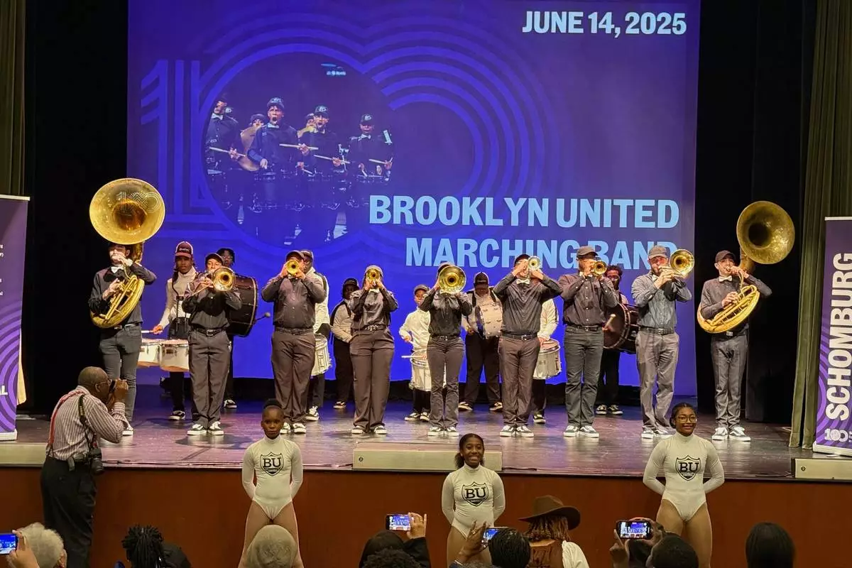 Brooklyn United Marching Band performs in the Langston Hughes Auditorium celebrating the centennial of the Schomburg Center for Research in Black Culture in New York, on Saturday, June 14, 2025. (AP Photo/Jaylen Green)