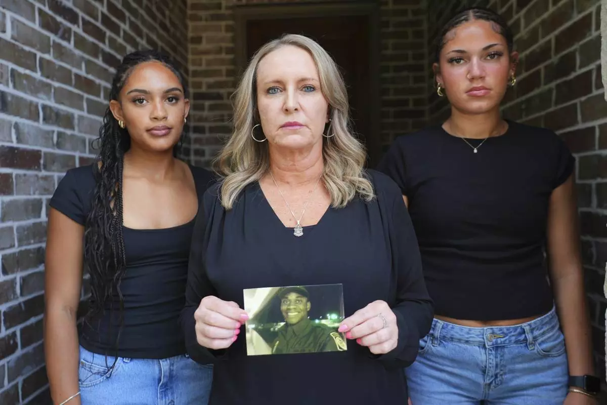 Lisa Afolayan, center, holds a photo of her late husband, U.S. Border Patrol agent Nate Afolayan, while flanked by their daughters, Lea Afolayan and Natalee Afolayan, at their home in The Colony, Texas, May 24, 2025. (AP Photo/LM Otero)