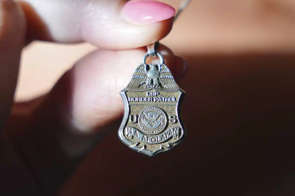Lisa Afolayan holds a charm she wears in memory of her late husband, U.S. Border Patrol agent Nate Afolayan, at her home in The Colony, Texas, May 24, 2025. (AP Photo/LM Otero)