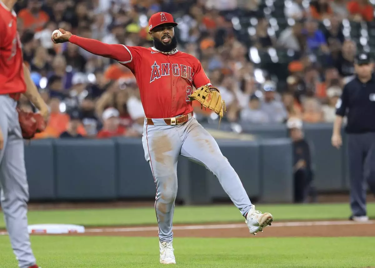 Los Angeles Angels third baseman Luis Rengifo fields a ground ball to record an out in the bottom of the third inning of a baseball game against the Baltimore Orioles, Friday, June 13, 2025, in Baltimore. (AP Photo/Alyssa Howell)