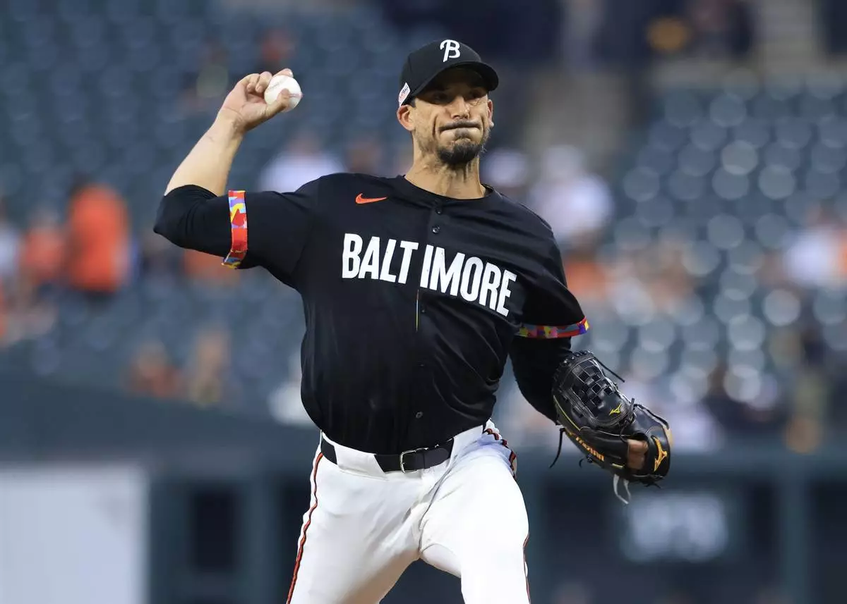 Baltimore Orioles pitcher Charlie Morton throws during the first inning of a baseball game against the Los Angeles Angels, Friday, June 13, 2025, in Baltimore. (AP Photo/Alyssa Howell)