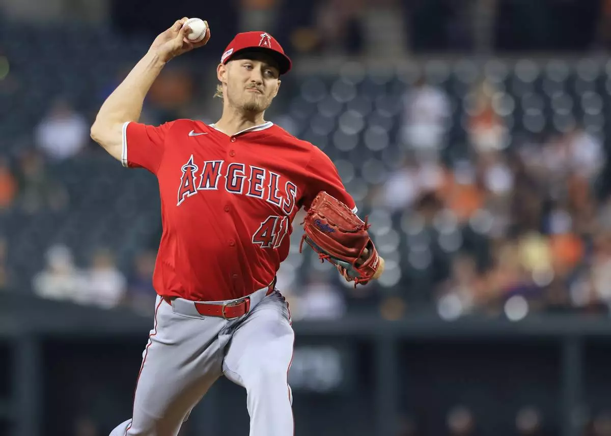 Los Angeles Angels starting pitcher Jack Kochanowicz throws in the first inning of a baseball game against the Baltimore Orioles, Friday, June 13, 2025, in Baltimore. (AP Photo/Alyssa Howell)