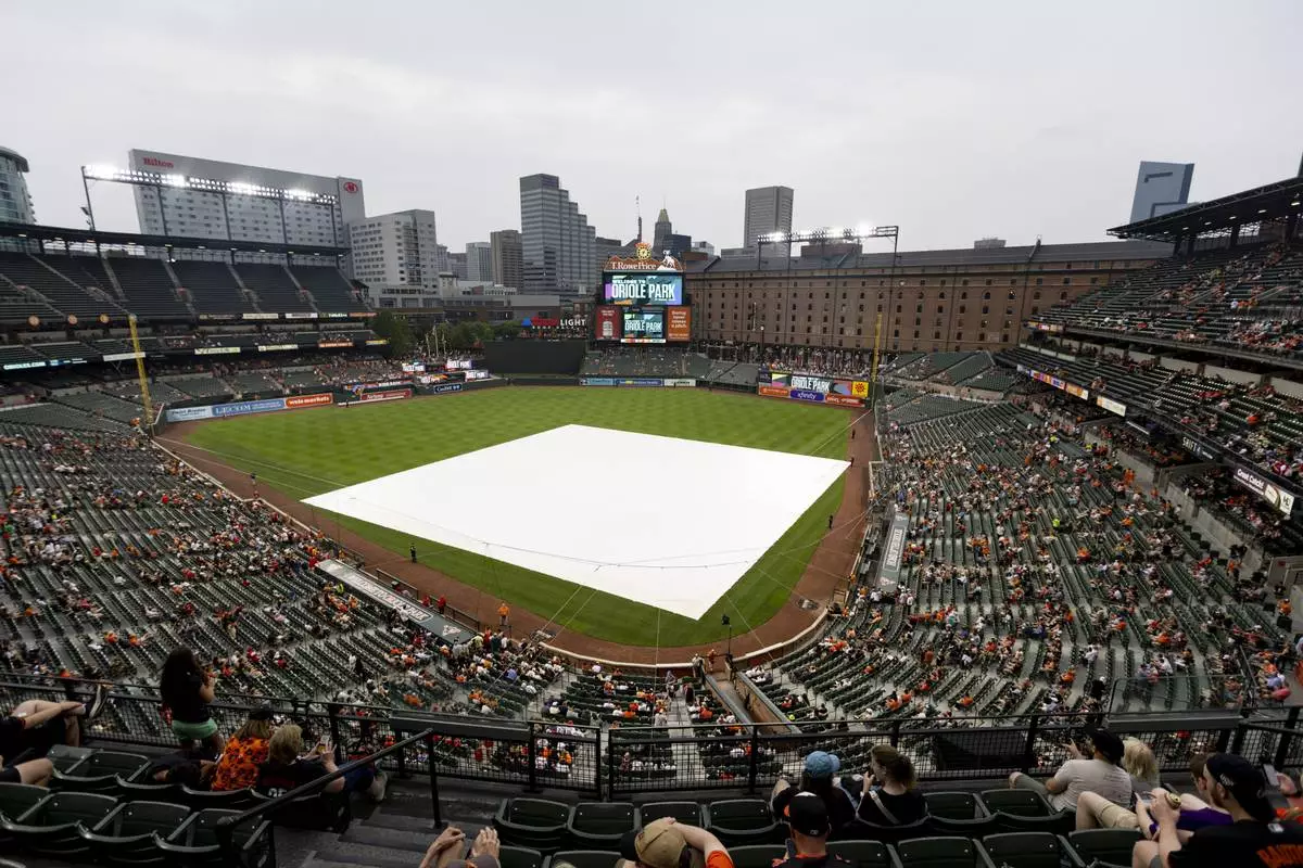The scoreboard warns of inclement weather in the area as a tarp covers part of the field before a baseball game between the Baltimore Orioles and the Los Angeles Angels, Friday, June 13, 2025, in Baltimore. (AP Photo/Alyssa Howell)
