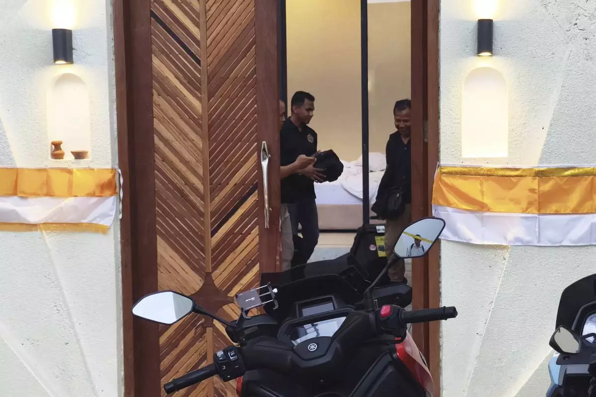Plain-clothed police officers are seen inside a villa where a shooting that led to the death of an Australian man reportedly occurred, in Badung on the resort island of Bali, Indonesia, Saturday, June 14, 2025. (AP Photo)