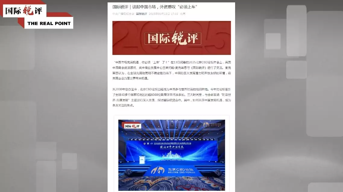 At the 2025 Beijing CBD Forum Annual Conference, which concluded on Friday, John McLean, a senior consultant to the China Chamber of Commerce in the UK (CCCUK) and the chairman of the China-UK Business Development Center (CUKBDC), told The Real Point that in a world full of turmoil and uncertainty, China's tremendous development potential and its open and friendly environment present opportunities for British businesses and the world at large.