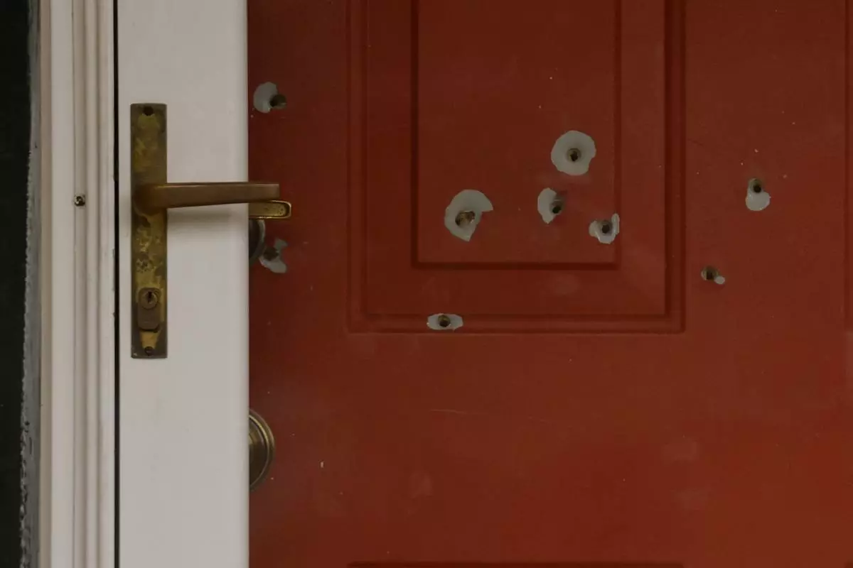 Multiple bullet holes could be seen in the front door of Hoffman’s home.