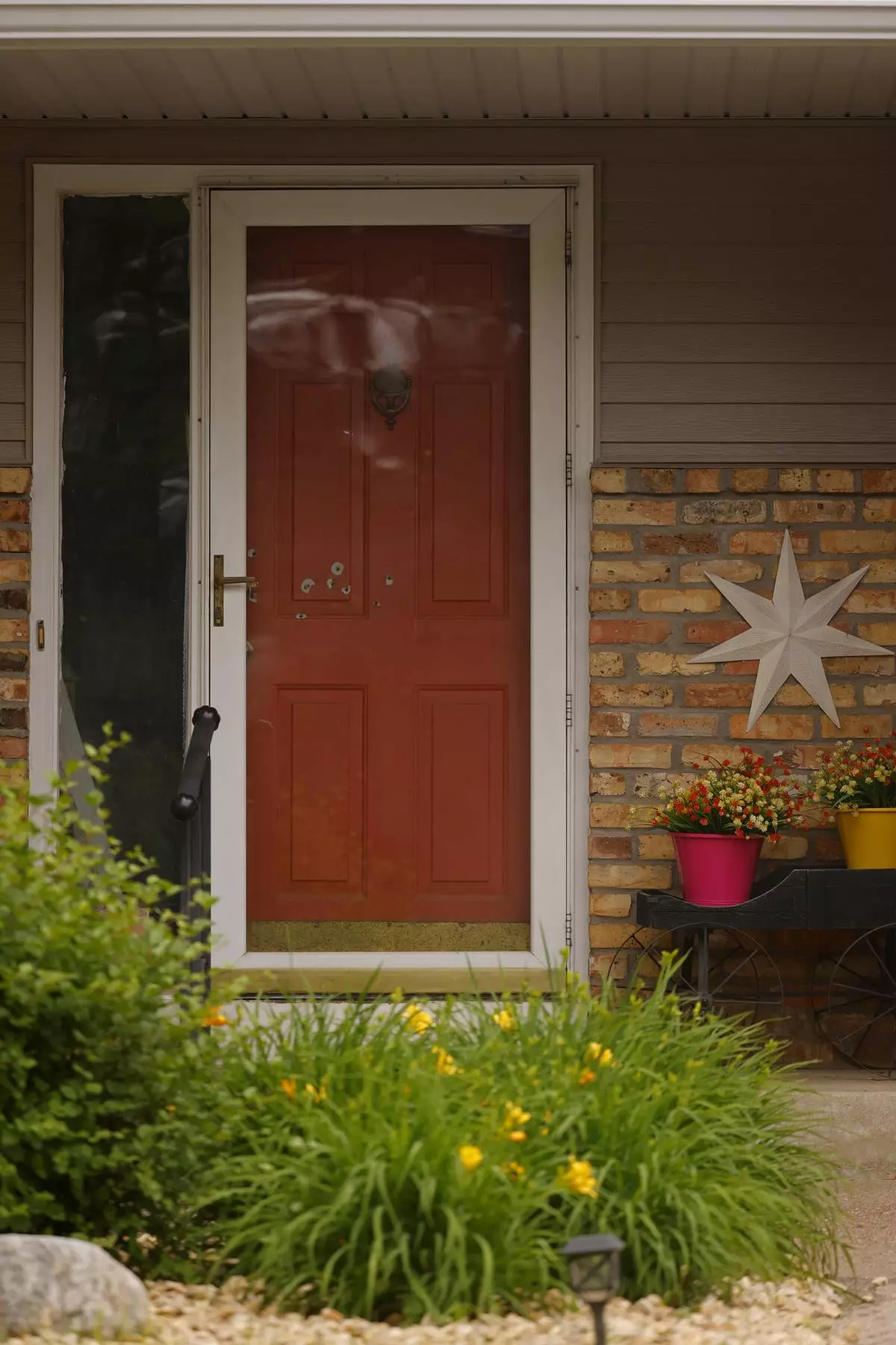Bullet holes mark the front door of the house of Minnesota state Sen. John Hoffman and his wife who were shot earlier in the day, Saturday, June 14, 2025, in Champlin, Minn. (AP Photo/Bruce Kluckhohn)