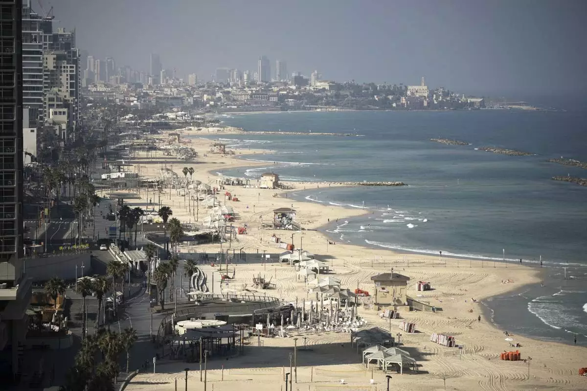A general view shows the mostly empty beachfront in Tel Aviv, Friday, June 13, 2025. (AP Photo/Leo Correa)