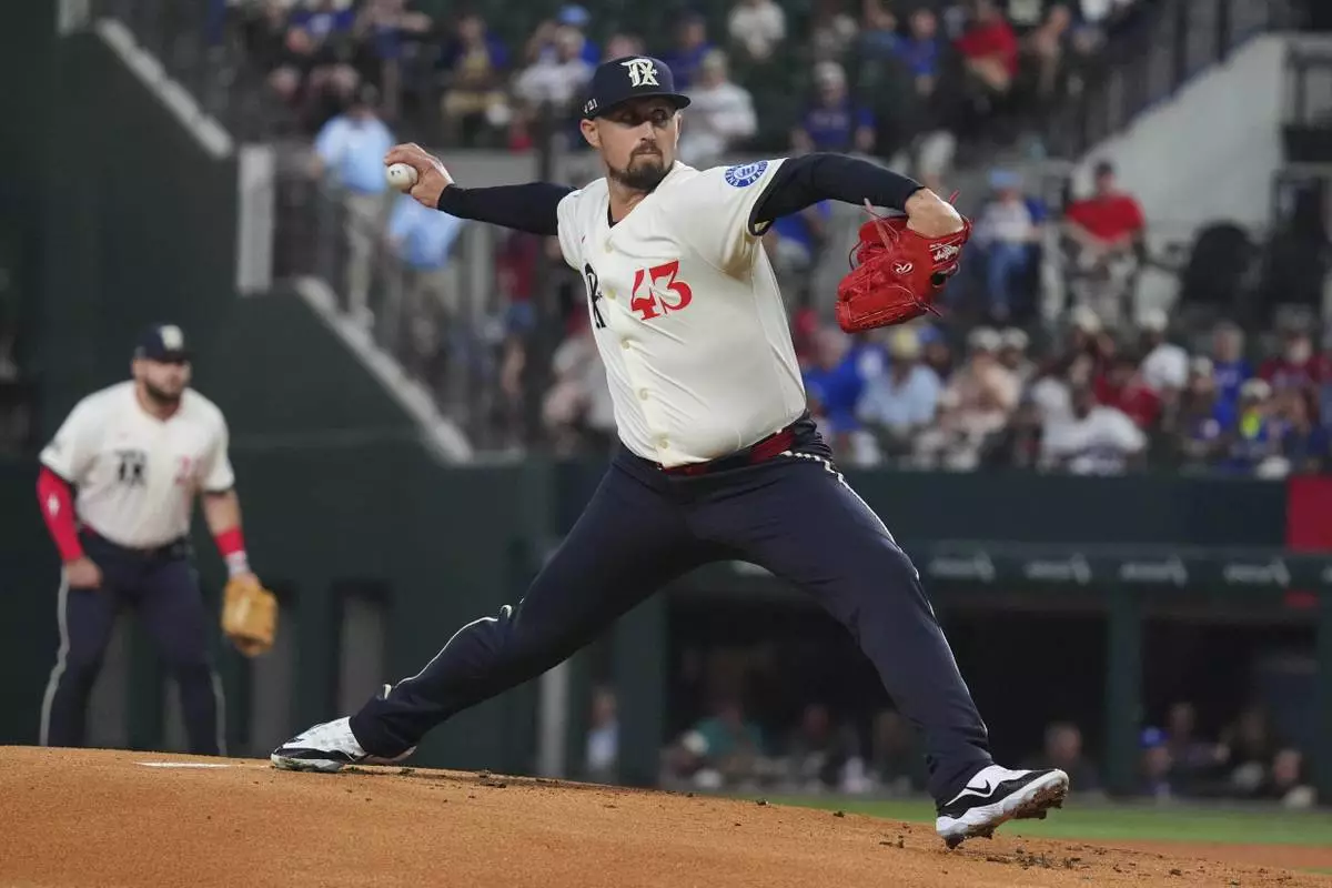 Texas Rangers starting pitcher Shawn Armstrong throws during the first inning of a baseball game against the Chicago White Sox, Friday, June 13, 2025, in Arlington, Texas. (AP Photo/LM Otero)