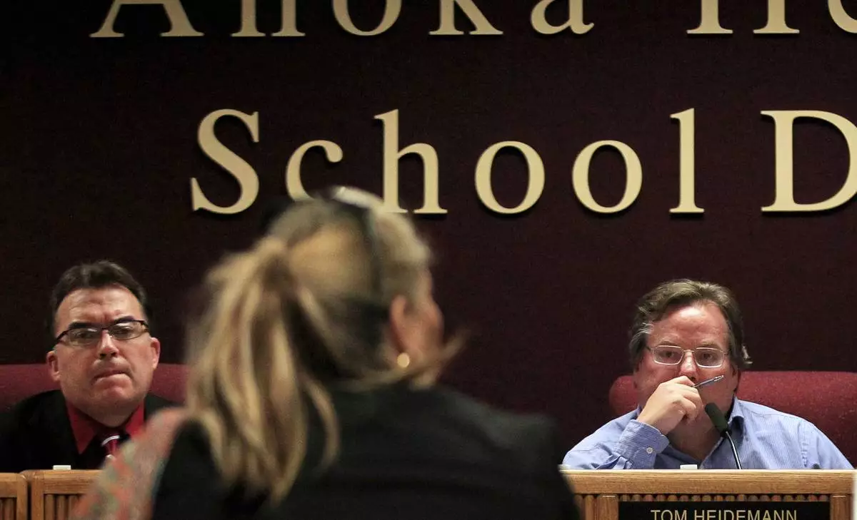 FILE - Vice Chair John Hoffman, left, attends an Anoka-Hennepin School Board meeting in Coon Rapids, Minn., Jan. 9, 2012. (Carlos Gonzalez/The Star Tribune via AP File)