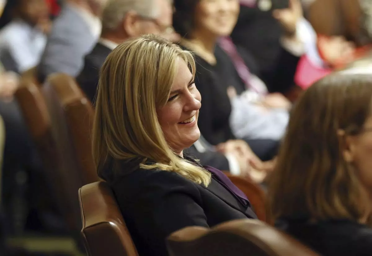 FILE - State Rep. Melissa Hortman, D-Brooklyn Park, smiles during the nomination process before she was elected speaker of the Minnesota House as the 2019 Legislature convened, in St. Paul, Minn., Jan. 8, 2019. (AP Photo/Jim Mone, File)